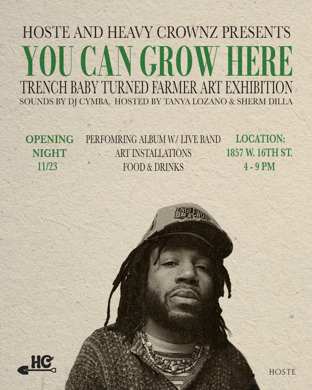 It’s time to grow again! We are excited to announce Heavy Crownz as the official Artist in Residence at Hoste Cocktails. From November 2025 - February 2026, the You Can Grow Here:Trench Baby Turned Farmer Art Exhibition will be on display coinciding with the rollout and release of the debut album. We invite you to the Opening Night, where we will unveil the exhibit and experience the music from the live band Heavy Crownz & the Growers. DJ Cymba will curate sounds that welcome us into this safe space, and community movers Tanya Lozano and Sherm Dilla will guide us through the journey of how a trench baby can turn into a farmer.